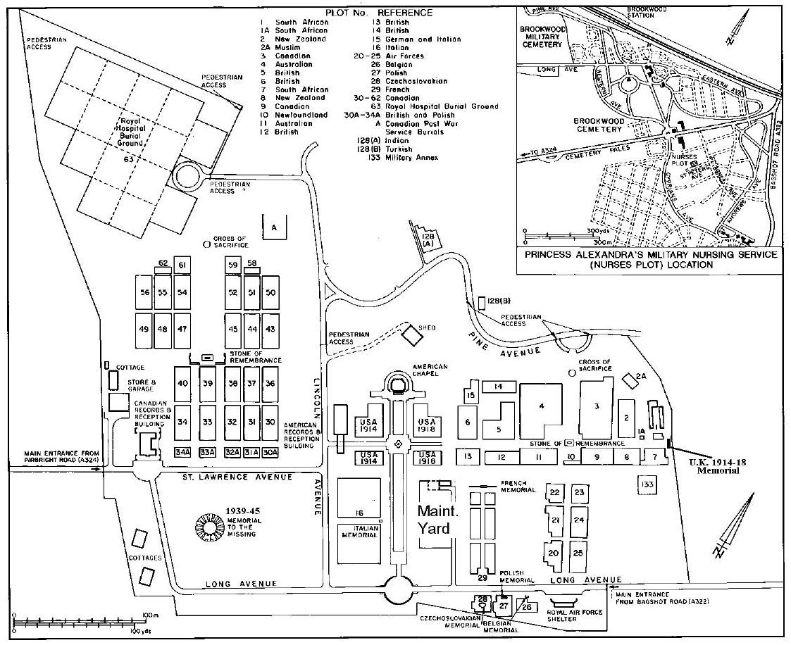 Brookwood American Cemetery and Memorial This 4.5-acre (1.8 ha) site lies to the west of the civilian cemetery. It contains the graves of 468 American military dead and a further 563 with no known grave are commemorated. It is administered by the American Battle Monuments Commission.