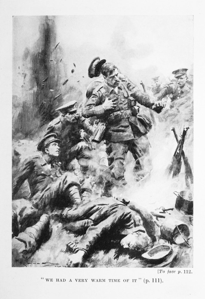 The second day of the fighting passed and the third came. Still we held on, but it became clear that we were too hopelessly outnumbered to hope for complete success at the time, and so we were{289} forced to leave the trenches. Withdrawing again, we took up positions in farmhouses and woods and any other places that gave shelter. All the time there was a killing fire upon us, and it happened that entire bodies of men would be wiped out in a few moments. A party of the Warwicks got into a wood near us, and they had no sooner taken shelter than the German gunners got the range of them, shelled them, and killed nearly all of them.