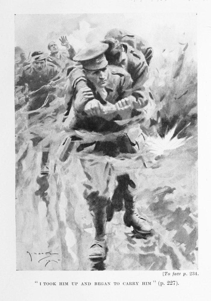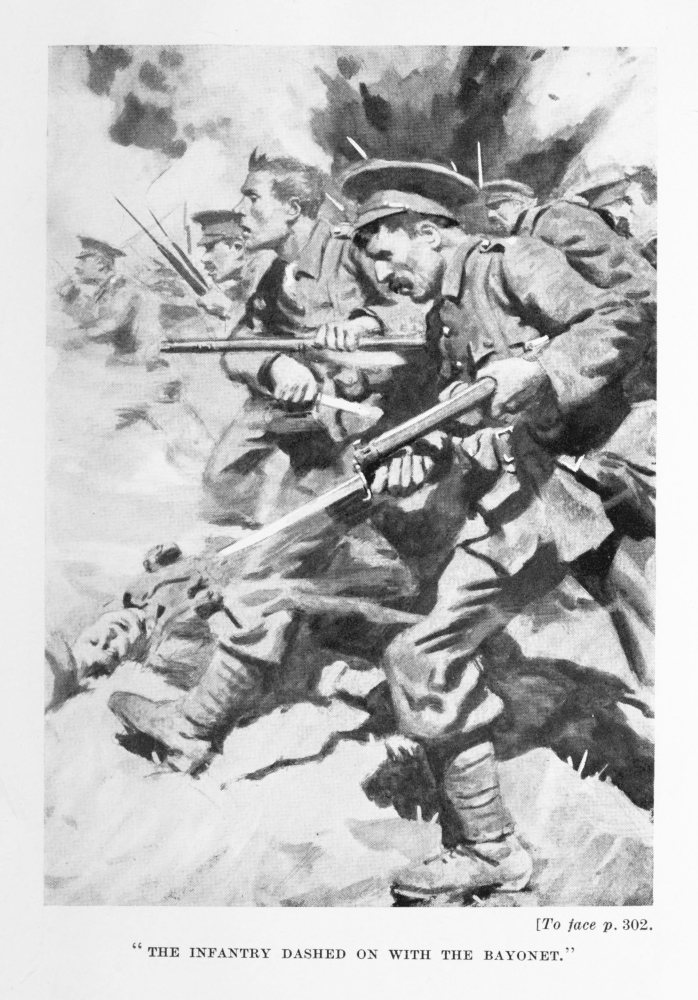 For half-an-hour the British artillery bombarded the enemy’s first line of trenches, and this fire to the Germans must have seemed as if hell had been let loose, because everything that was in the line of fire{294} was blown away or levelled to the ground—walls, trees, buildings, sandbags, even the barbed wire entanglements were carried away by shell splinters and shrapnel bullets, though unfortunately some of the entanglements escaped injury, and became death-traps for a number of our fine fellows who were hurling themselves upon the Germans.