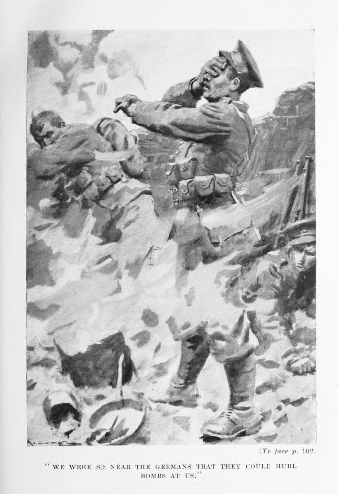 The Germans were close enough to fling hand-bombs at us. They gave us lots of these little attentions, so that when I suddenly found myself blinded, and felt a sharp pain in my left hand, I thought they had made a lucky shot, or that something had exploded in the fire in the biscuit-tin.