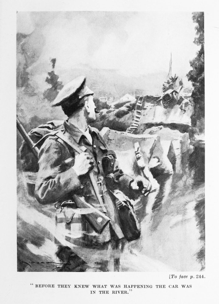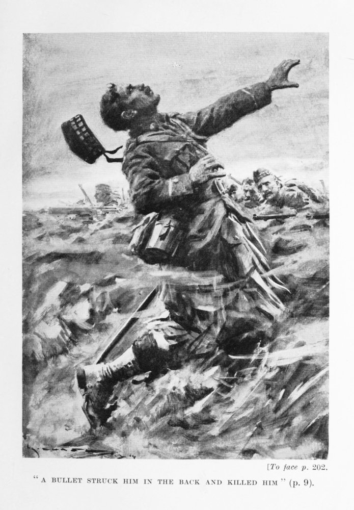 For half-an-hour the British artillery bombarded the enemy’s first line of trenches, and this fire to the Germans must have seemed as if hell had been let loose, because everything that was in the line of fire{294} was blown away or levelled to the ground—walls, trees, buildings, sandbags, even the barbed wire entanglements were carried away by shell splinters and shrapnel bullets, though unfortunately some of the entanglements escaped injury, and became death-traps for a number of our fine fellows who were hurling themselves upon the Germans.