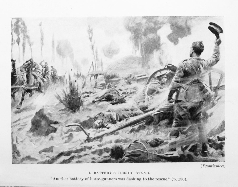 [Frontispiece. L BATTERY’S HEROIC STAND. “Another battery of horse-gunners was dashing to the rescue” (p. 130).