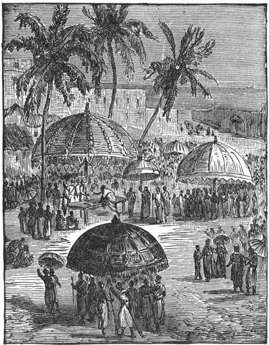 Mr. Stanley and his comrades moved steadily forward, and on December 3d were met by Major Wissmann at Atoni on the Kinghani River. The occasion was duly celebrated by the drinking of healths and loyal toasts in bumpers of champagne. Major Wissmann provided horses, and Mr. Stanley and Emin Pasha made a triumphal entry into Bagamoyo at 11 o'clock on Wednesday morning, December 4th. The town was profusely decorated with bunting and verdant arches, and palms were waving from every window. Major Wissmann's force and the German man-of-war "Sperber" fired salutes. All the vessels in the roadstead were handsomely decked with flags.